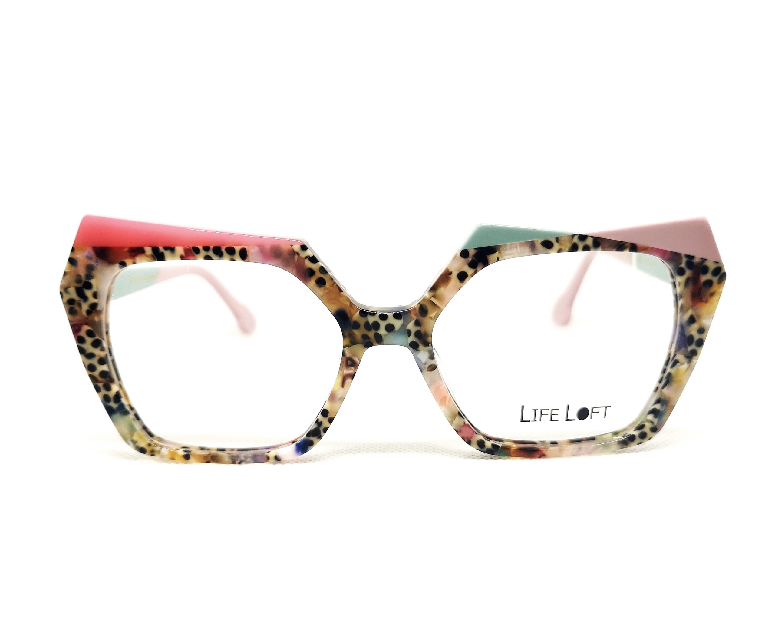 Gafa de graduado de la icónica marca LIFE LOFT, diseñadas en España con materiales de alta calidad y resistencia. Presenta frente de forma cuadrada contruida en acetato de alta calidad con estampado de lunares combinado con diferentes formas geometricas en tonos pastel en la parte superior de la montura. Una gafa diferente, femenina y divertida.