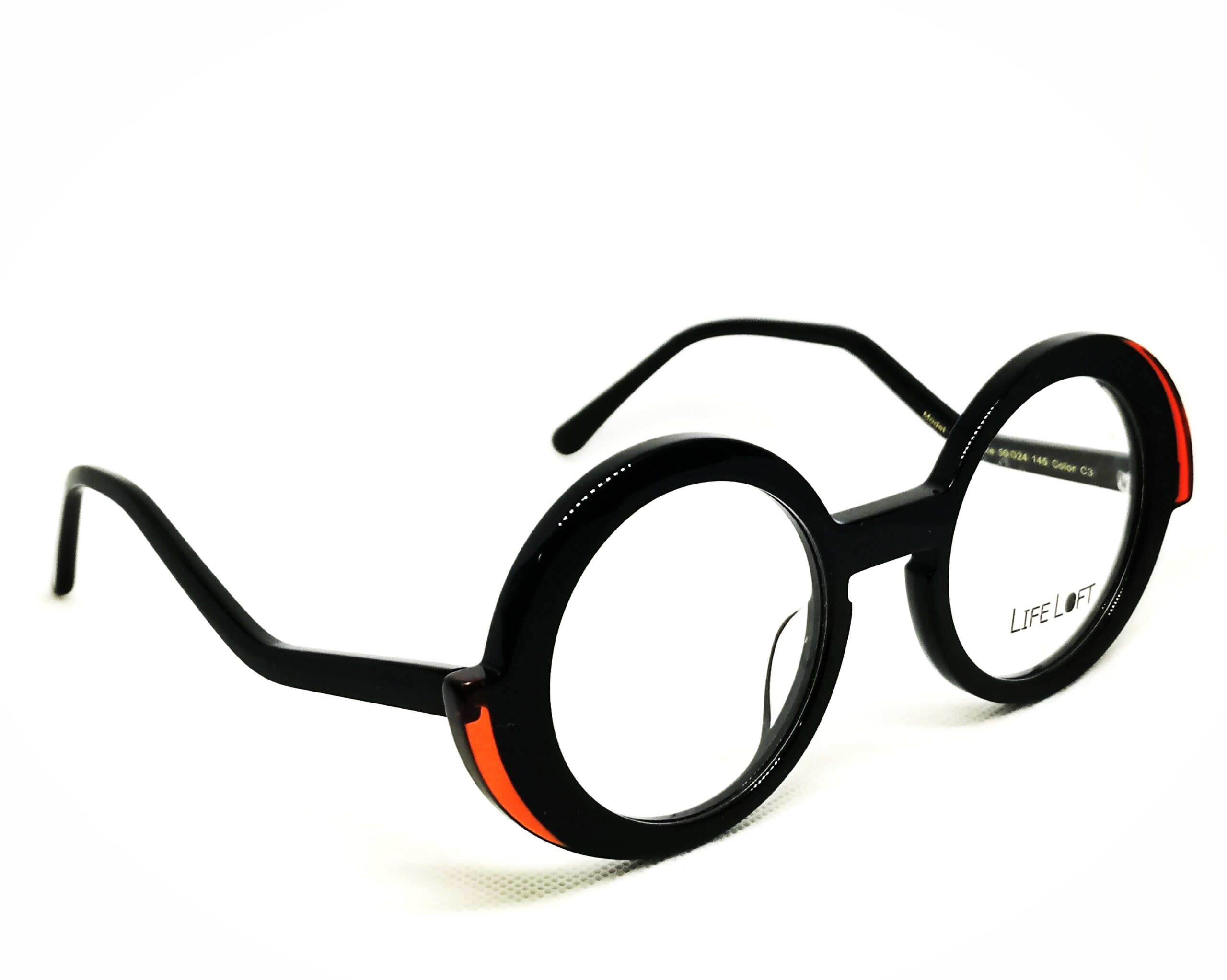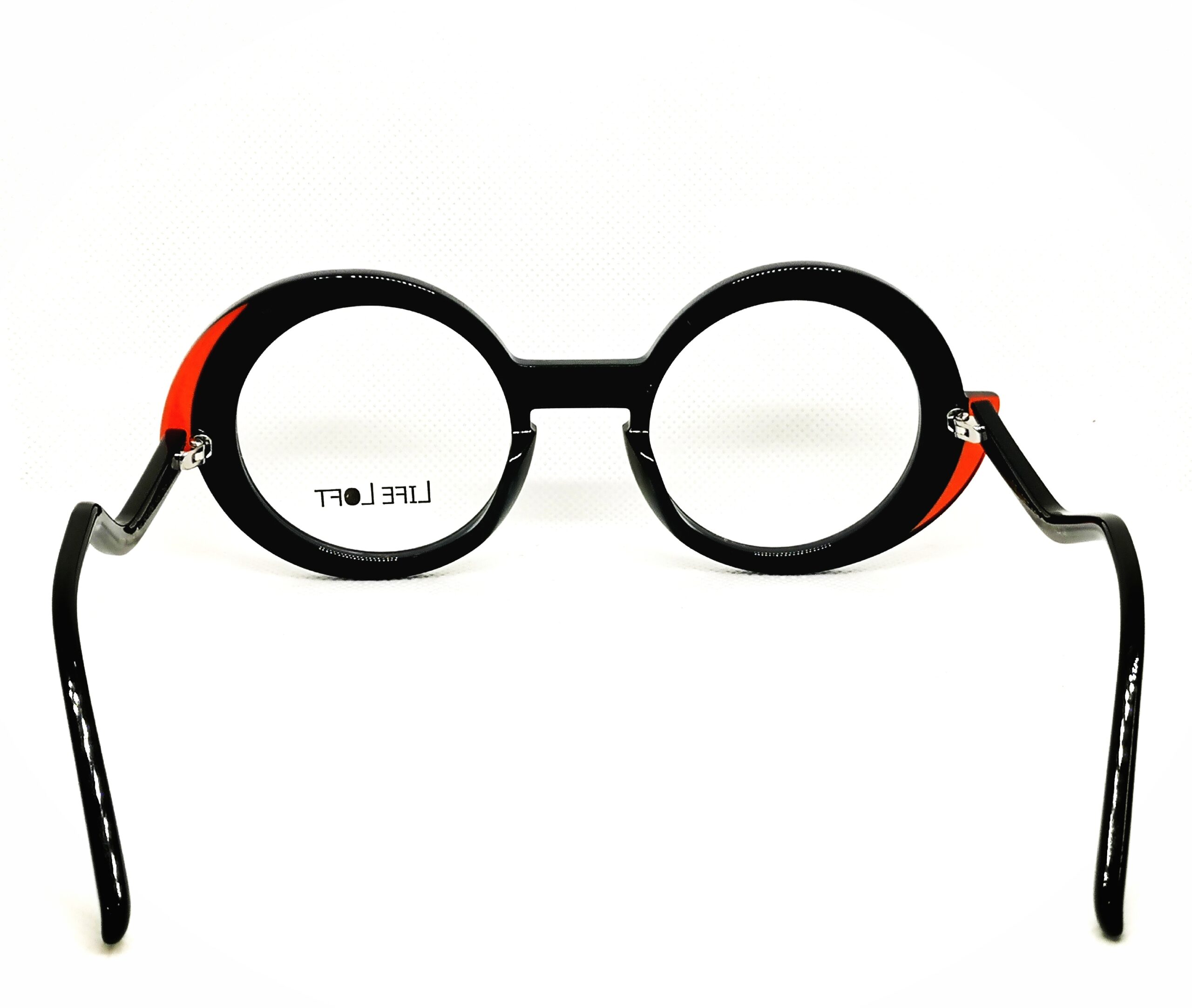 Gafa de graduado de la icónica marca LIFE LOFT, diseñadas en España con materiales de alta calidad y resistencia. Construidas en acetato color negro, presentan un frente de forma redonda que rompe con pequeños apliques contrapuestos en color rojo. Las varillas con divertidas curvaturas añaden el toque de distinción y coronan este divertido diseño. Una gafa versátil, diferente, juvenil y divertida.