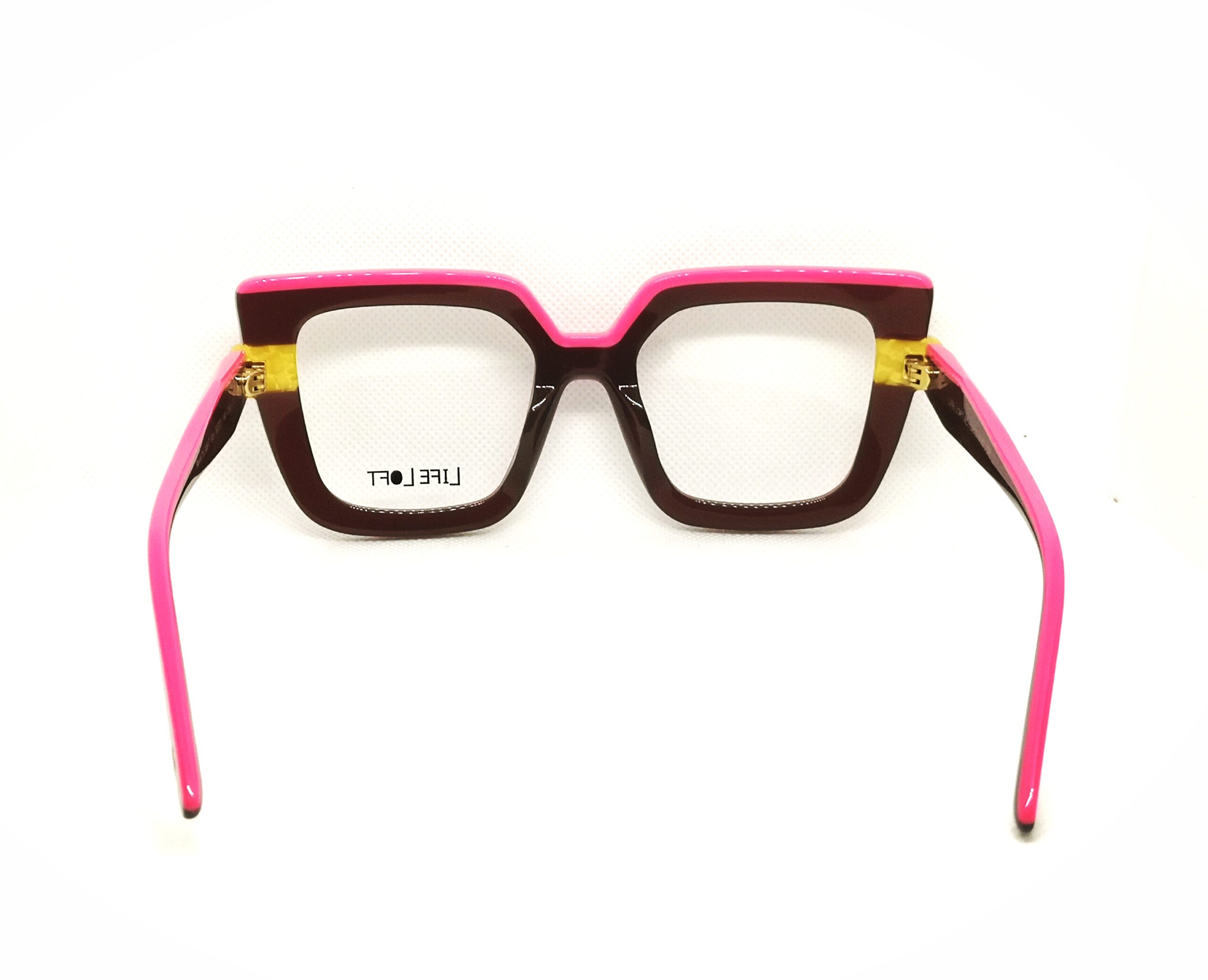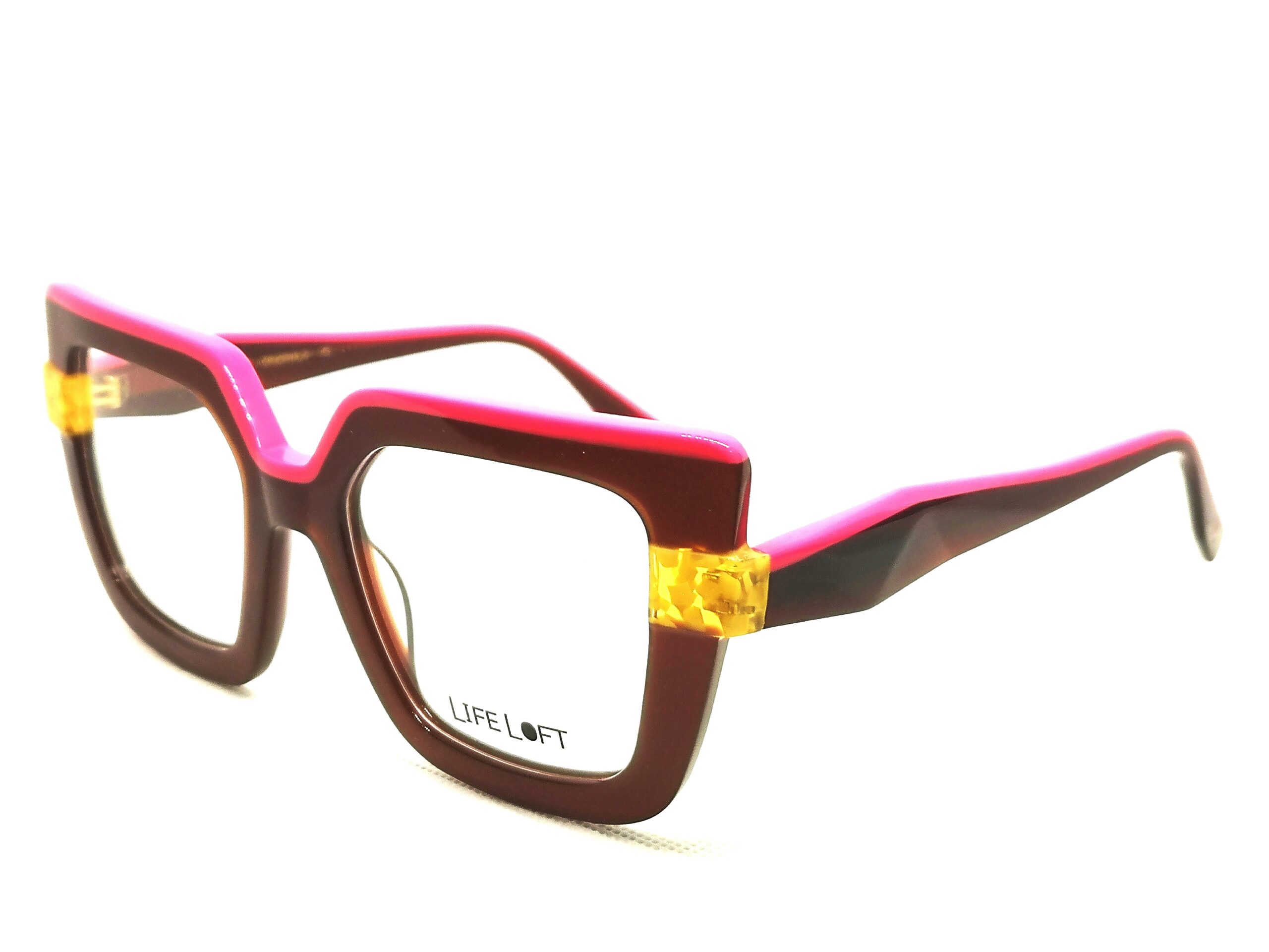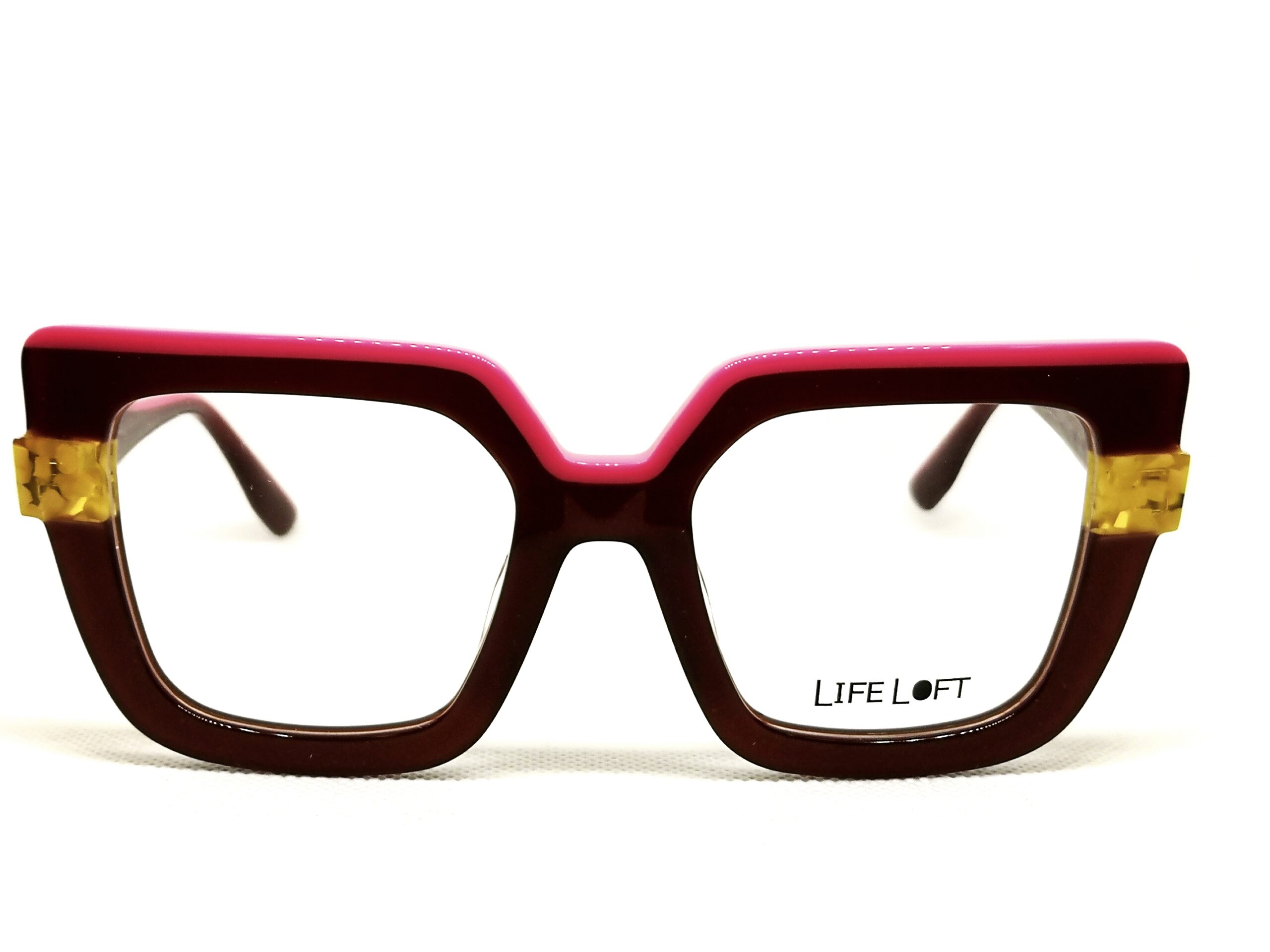 Gafa de graduado de la icónica marca LIFE LOFT, diseñadas en España con materiales de alta calidad y resistencia. Presenta frente de forma cuadrada en acetato de color granate que contrasta con un divertido perfil en rosa fucsia y detalles laterales en amarillo. Una gafa con carácter, femenina y divertida.